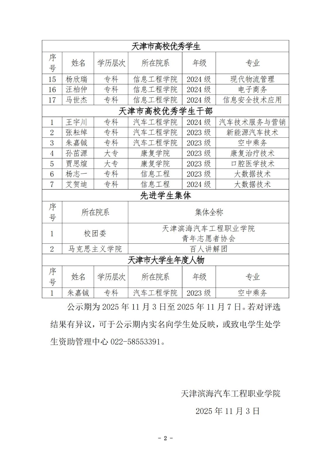2024-2025学年天津市普通高校优秀学生(优秀学生干部) 先进学生集体 大学生年度人物评选结果公示